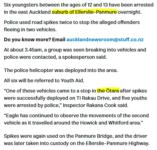 How many stuff-ups can Stuff get into one article? Ellerslie-Panmure isn’t a suburb, “the Otara” makes no sense, and in any case five of the arrests were in Otara which is nowhere near Ellerslie or Panmure.