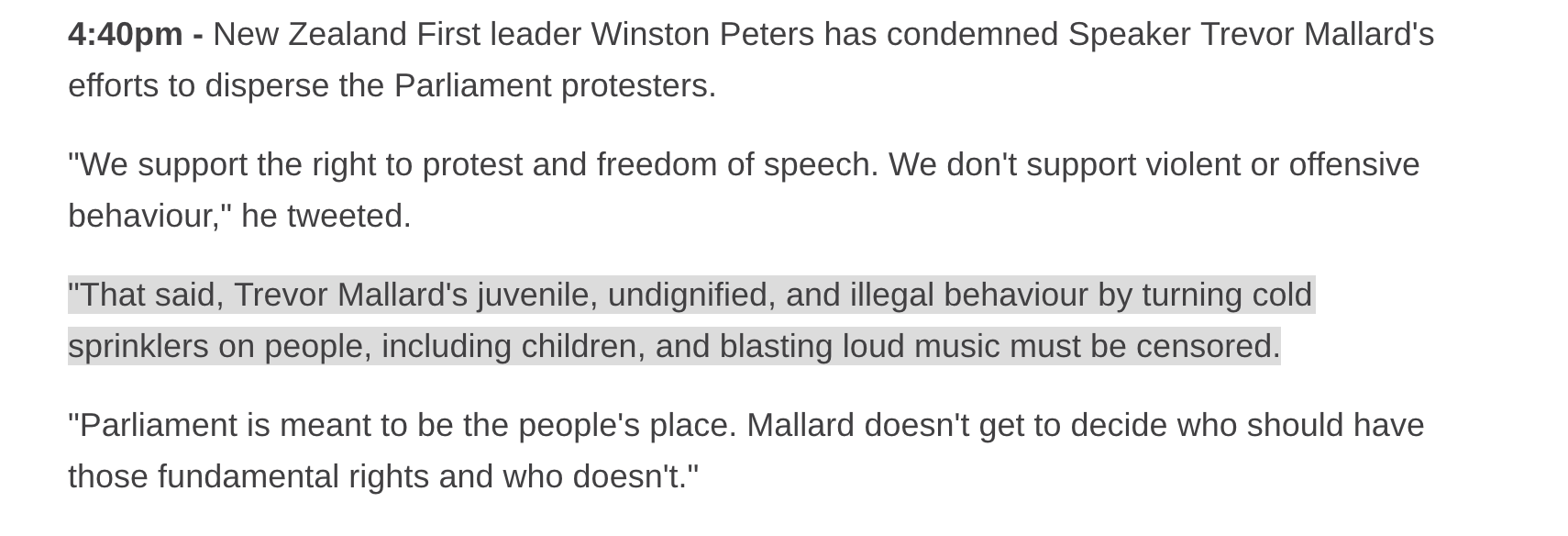 “That said, Trevor Mallard’s juvenile, undignified, and illegal behaviour by turning cold sprinklers on people, including children, and blasting loud music must be censored.”