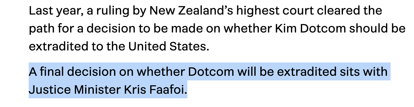 Stuff; “A final decision on whether Dotcom will be extradited sits with Justice Minister Kris Faafoi.” Nope, that will be Kiri Allan.