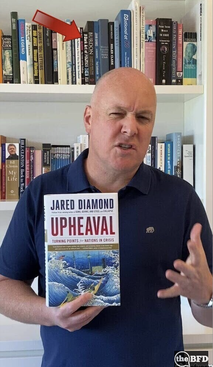 The book directly above his ear is “Dark Art Of Politics“