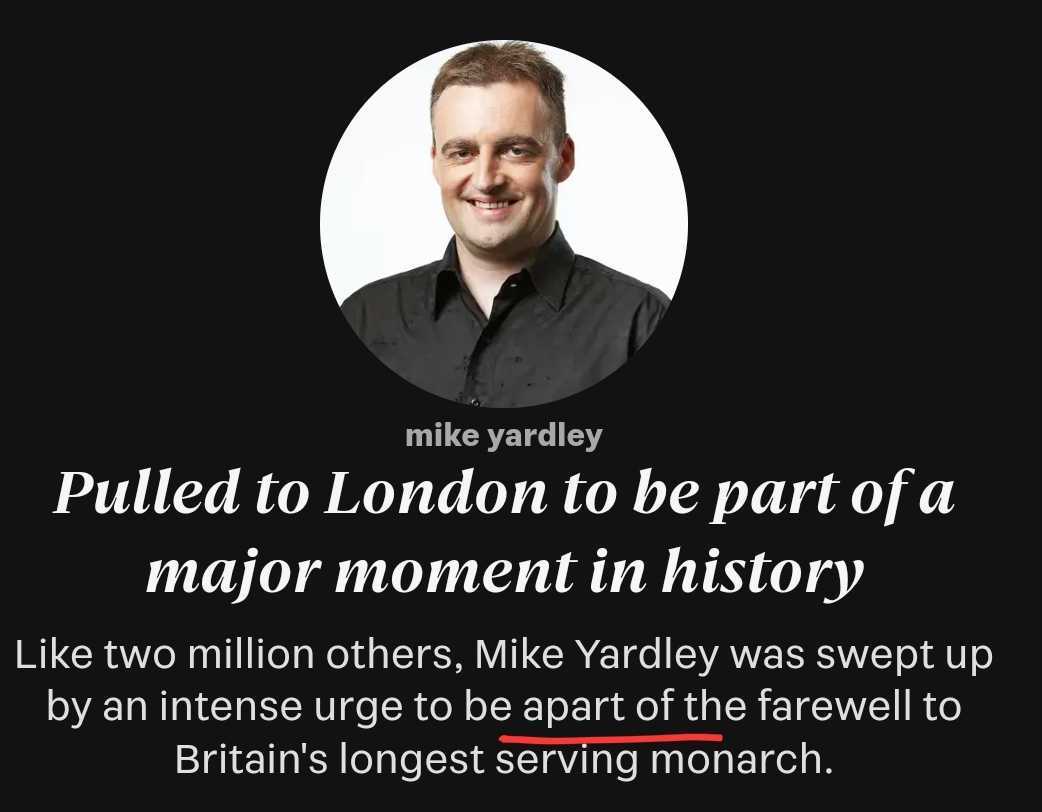Is he apart (separated from) or at (a part) the Queen’s funeral?