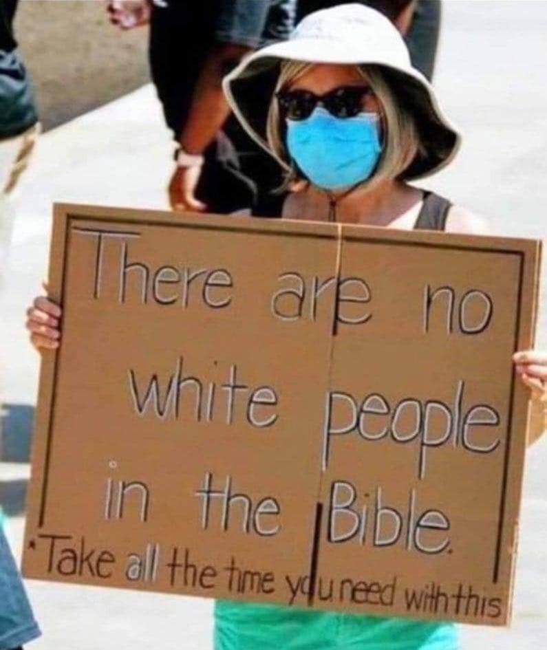 But that kind of dumbarsity is nothing to the white, female protester holding up a sign reading, “There are no white people in the Bible. Take all the time you need with this.”