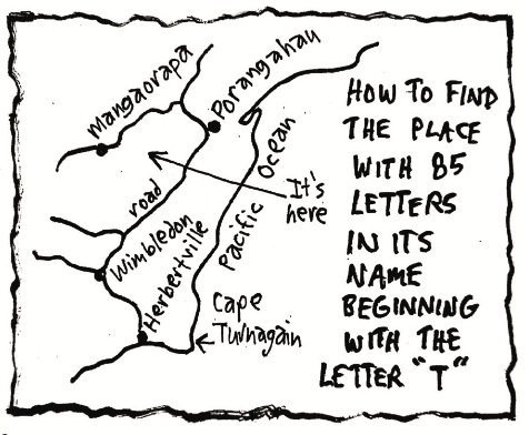 There are something like 2,021 Maori place names in New Zealand. Of these 78% begin with one of only six letters (K, M, O, P, T, W). Altogether in New Zealand (Maori and English place names), 50% of them begin with only these six letters (“W” is the most common letter, 20% of all the place names in New Zealand begin with the letter “W”).