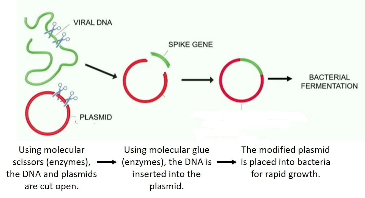 To produce a protein for pharmaceutical manufacturing purposes, molecular biologists take the piece of DNA they want, eg DNA of the spike protein, and use molecular scissors (enzymes) to cut the gene out of the DNA and then insert it into the plasmid, using molecular glue (enzymes). The plasmid is then inserted into the bacteria using a process known as transformation which enables rapid growth and replication.