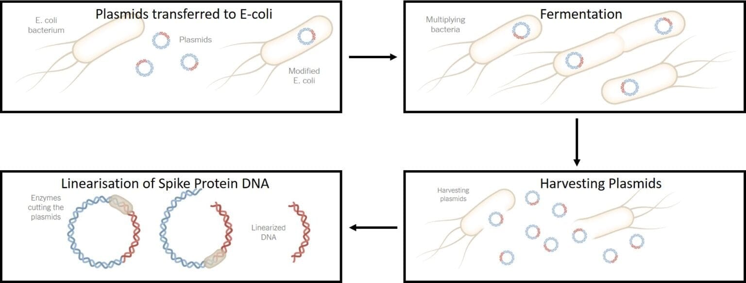 The spike-gene-modified plasmids are transferred into E coli bacteria and grown rapidly (fermented) in large vats of nutrient-rich media. After amplification bacteria are then broken apart (ie lysed), to harvest the plasmids. The spike genes (now in billions of copies) are removed from the plasmids and cut into straight segments, a process called “linearisation”.
