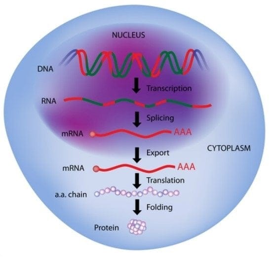 In order to make a protein, human double-stranded DNA in the nucleus of the cell is transcribed into single-stranded RNA. The RNA is then spliced into ‘messenger RNA’ (mRNA), which is transported from the cell nucleus and into the cytoplasm (the part of the cell outside of the nucleus). Here the mRNA is used as a blueprint for making amino acid chains, which then combine to form protein.