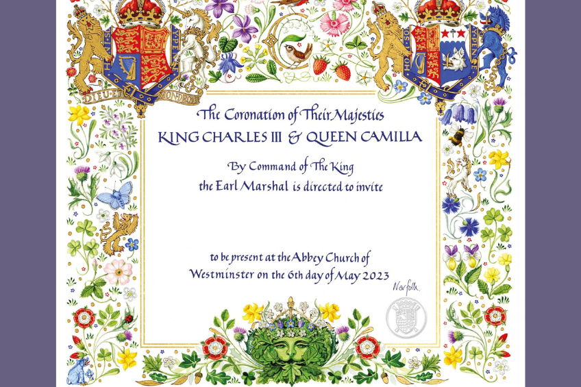 First, the coronation invitation. Of particular note was the design of the art on the invitation, which is known as the “Green Man.” Some claim the Green Man, an image of a green face made from flowers, leaves, and plants, is from paganism, while some claim it is just a piece of British folklore that has even made appearances in English churches. Regardless, placed largely and prominently, centred at the bottom of the invitation, was this image of the Green Man to emphasize King Charles’ commitment to, and passion for, the environment. Oh, and the card was made from recycled paper, of course.