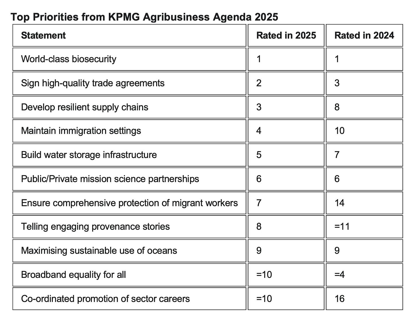 The KPMG Agribusiness Agenda 2025 surveyed 94 industry leaders and influencers and asked them to rate 37 statements in terms of “the priorities for their organisations in the food and fibre sector”. KPMG has run the Agenda survey since 2010. This year, the top 10 rated statements are: