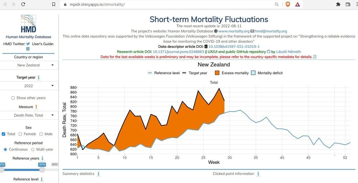 Yearly excess mortality data is available as a visual interactive at the Human Mortality Database, with New Zealand data taken from StatsNZ since 2010. The pale blue line in the graph shows average mortality across the years 2010-2019. In no prior year does New Zealand’s excess mortality trend so consistently above the average as it has throughout 2022.