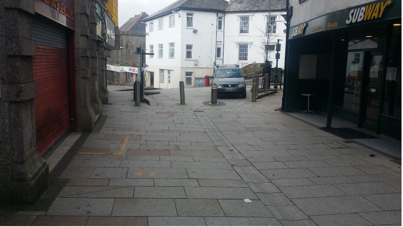 The pictures following are all of Fore Street (High Street), looking in both directions and the connecting road from the downtown car park. Taken at 12-30 pm today, the anniversary of the first lockdown.