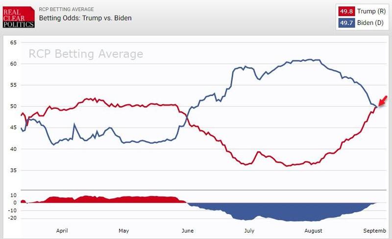 The trend we have been noting for the last week has accelerated overnight and ‘the streams have crossed’, with the average bookie now seeing it more likely that President Trump wins the 2020 election that Joe Biden.