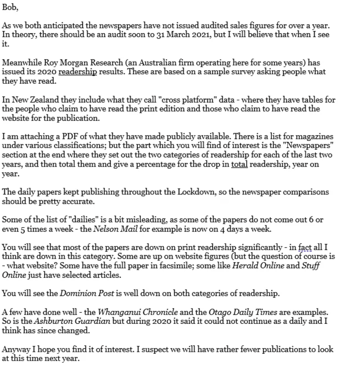 The magazine story is equally disastrous, including on-line media. By far the biggest collapse is National Business Review.