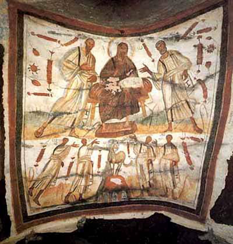 By the fourth century, Christianity had come to enjoy state sanction in the Roman Empire. This fresco relates to some of the most powerful figures in church history. Not only does it show Jesus between Peter and Paul, it was painted in a catacomb in Rome near a villa once belonging to the Emperor Constantine, whose conversion in 312AD was a turning point. The four figures in the lower part of the fresco are the martyrs Gorgonius, Peter, Marcellinus and Tiburtius, who were buried in the catacomb.