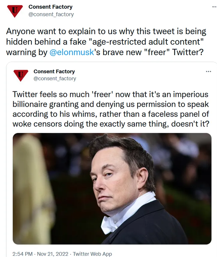 On October 27, 2022, so almost exactly a month ago, Elon Musk, the richest man in the world, CEO of Tesla and SpaceX, US government military contractor and all-around global-capitalist oligarch with a net worth approaching $200 billion, completed his acquisition of Twitter, the notorious “hell-site” where Donald Trump, the Russian-backed literal Resurrection of Hitler, Jordan Peterson, the “lobster hierarchy” guy, Alex “the Devil Incarnate” Jones, and assorted members of the “deplorable” masses had been wantonly perpetrating acts of “hate speech,” disseminating “disinformation,” and otherwise unrestrainedly expressing themselves, until Twitter’s “content moderators” started censoring, deboosting, and deplatforming everyone whose views and opinions they didn’t like.
