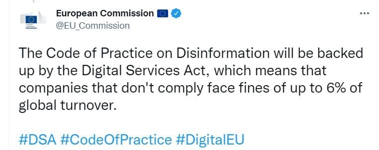 But with the passage of the DSA, the Code of Practice is evidently not so “voluntary” anymore. There is no need for complex legal analyses to show that the sanction provisions in the DSA are intended as the enforcement mechanism for the Code of Practice. The European Commission has said so itself – and in a tweet no less!