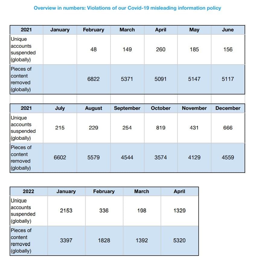 Twitter’s reports, for example, contain detailed statistics on Covid-related content removal and account suspensions. The below chart, showing the evolution of these numbers from February 2021 (shortly after vaccine rollout) through April 2022, is taken from Twitter’s latest available report from June of this year.
