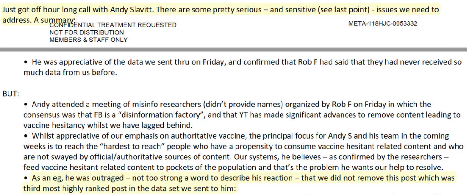 Only after the committee announced its intention to hold Mark Zuckerberg in contempt did Facebook produce ANY internal documents to the committee, including these documents, which PROVE that government pressure was directly responsible for censorship on Facebook.