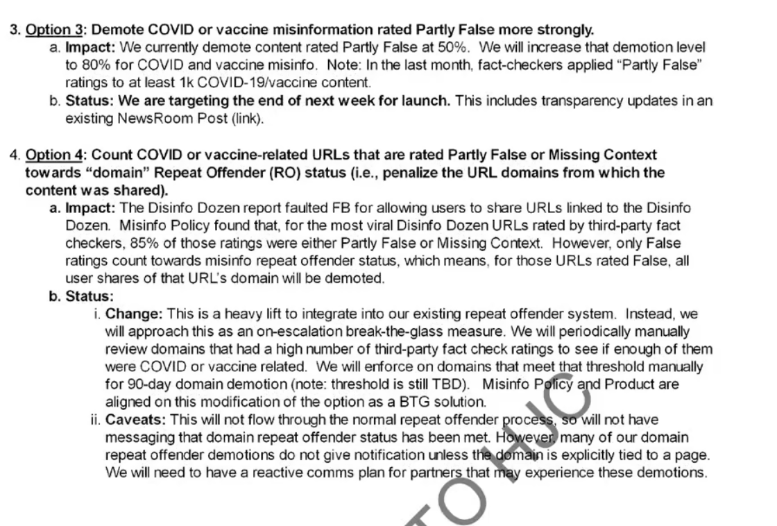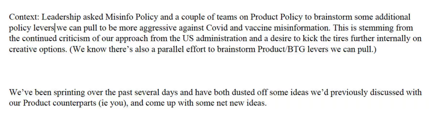 August 2, 2021: “[Facebook’s] Leadership asked Misinfo Policy … to brainstorm some additional policy levers we can pull to be more aggressive against … misinformation. This is stemming from the continued criticism of our approach from the [Biden] administration.”