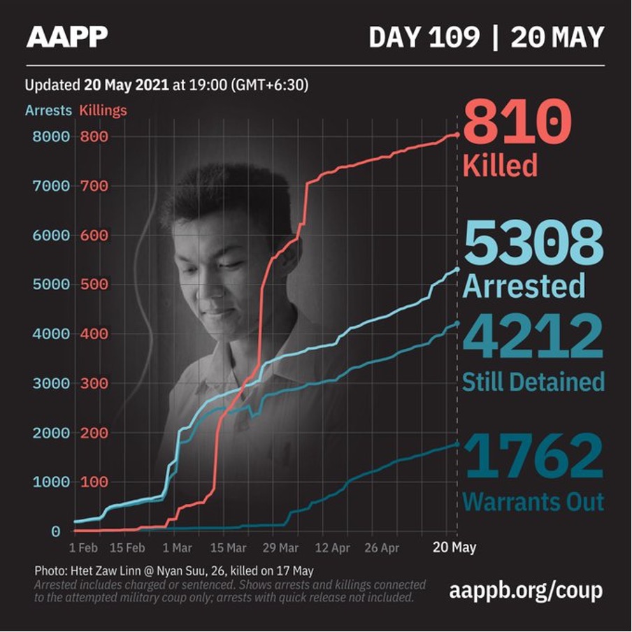 As of Wednesday, more than 800 people had been killed by the regime since the Feb. 1 coup, according to the Assistance Association for Political Prisoners-Burma (AAPP), which has been monitoring civilian casualties caused by the junta.