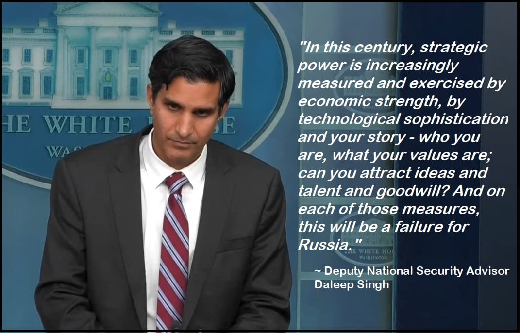 …”Ultimately, the goal of our sanctions is to make this a strategic failure for Russia; and let’s define a little bit of what that means. Strategic success in the 21st century is not about a physical land grab of territory; that’s what Putin has done.