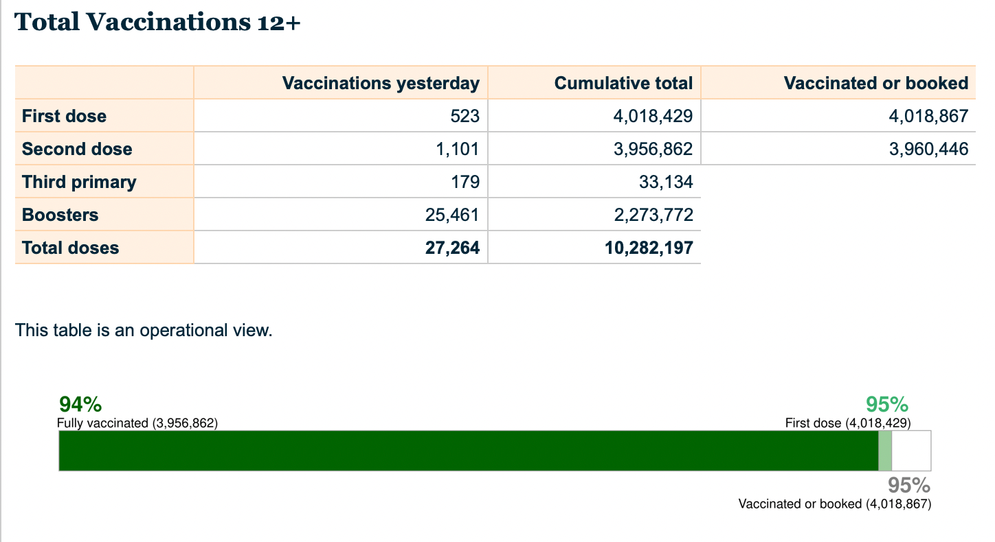 The numbers are even more impressive when considering only those over 12 years of age. 95% of everyone over in that demographic has been at least partially vaccinated or booked their appointment. 94% are fully vaccinated: