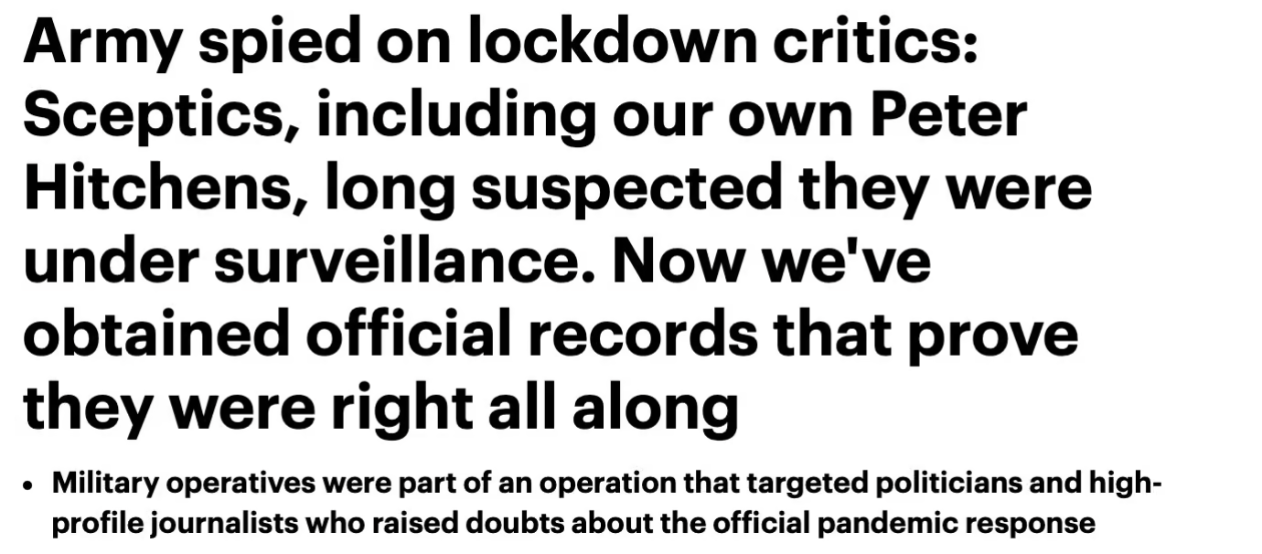 If you scroll to the bottom of the article, you’ll find that the Mail also published an accompanying commentary from the anonymous whistleblower, “This snooping was wrong, it hangs over my proud Army career like a black cloud,” and a commentary from Peter Hitchens, “How shadowy censors tried to remove my ‘unhelpful’ Covid views from YouTube”.