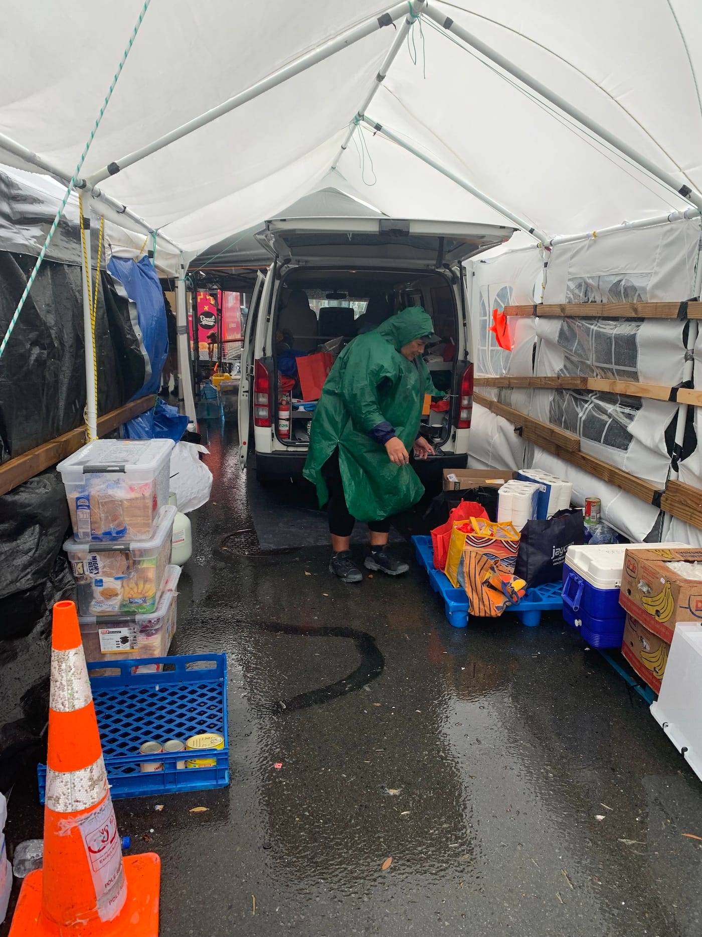 Inside were many more people, either doing what we were and dropping off dry clothes or taking off wet clothes and exchanging them. We handed the box over to one of the organisers who thanked us profusely. My buddy had gone to the effort of finding and buying plastic ponchos which were in high demand in the rain.
