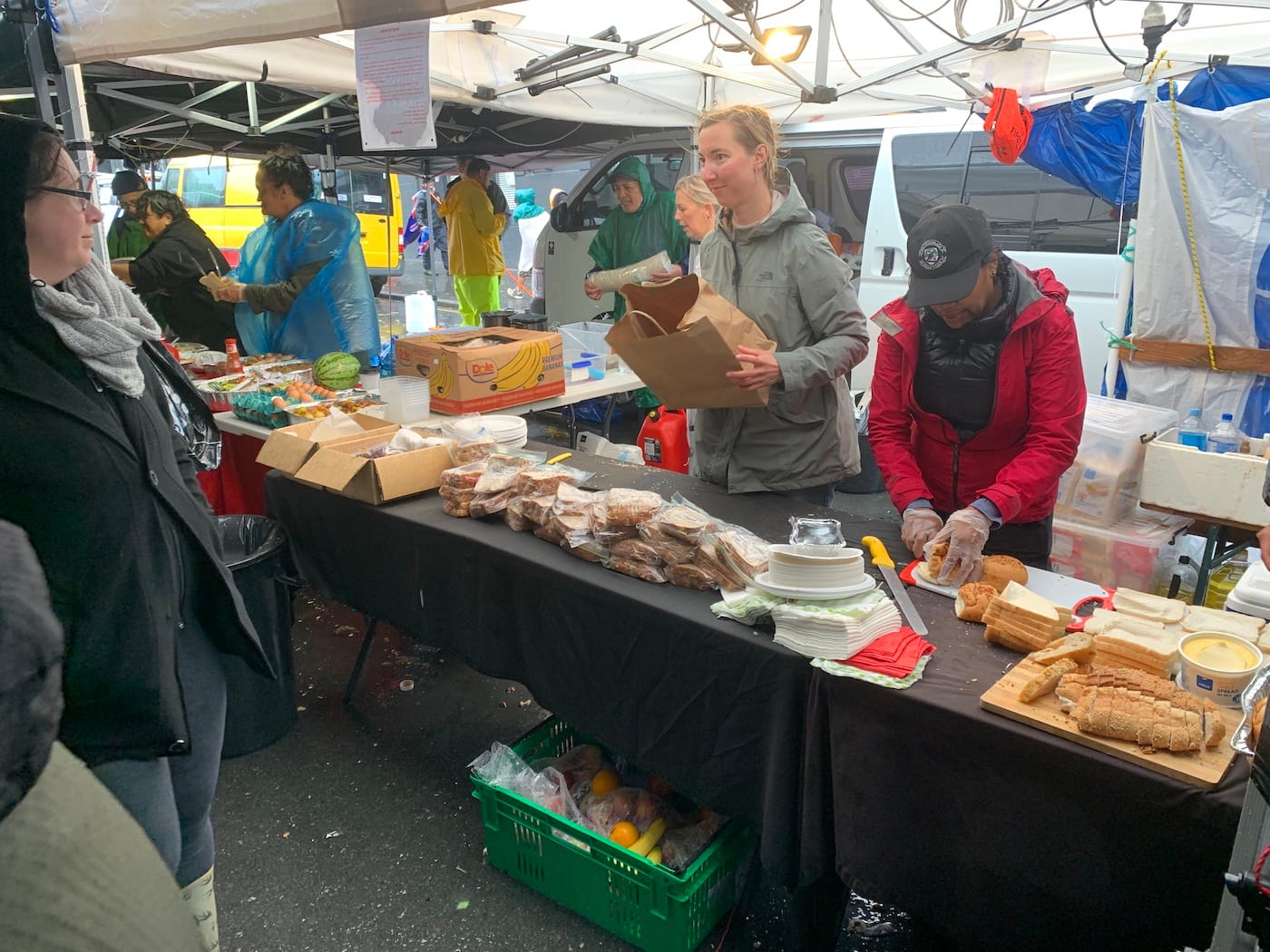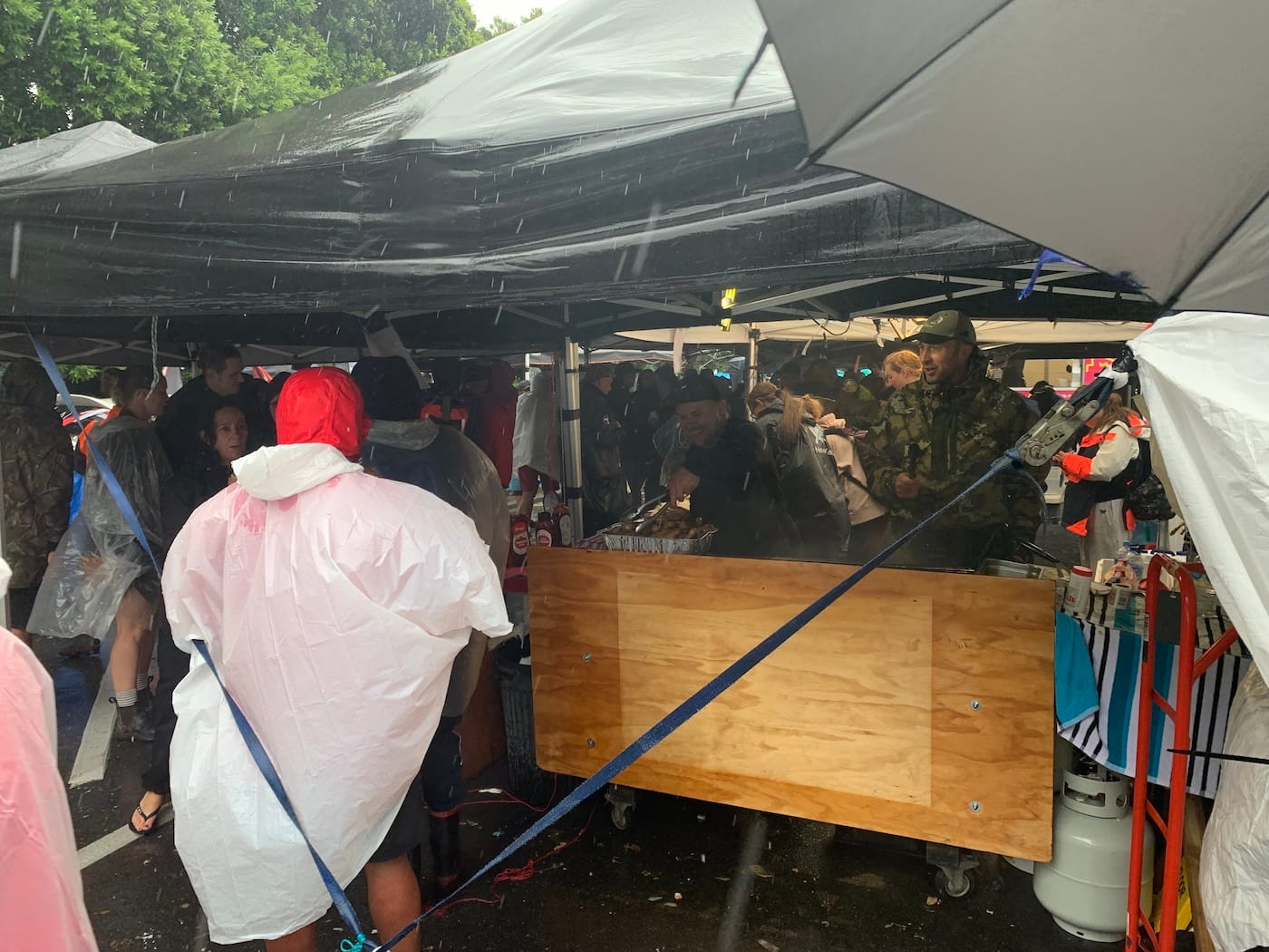 Outside were more tents and gazebos where the food service area was. There were hundreds of people milling around under the cover, and many more preparing food. There were barbeques with sausages and meat patties, roast vegetables, eggs, sandwiches, snacks, even pinwheel scones! We felt a bit awkward having food but were encouraged by some of the other people there so we ended up enjoying a sausage in bread with sauce and chatting to some other people there. There was coffee and tea available and cold drinks too.