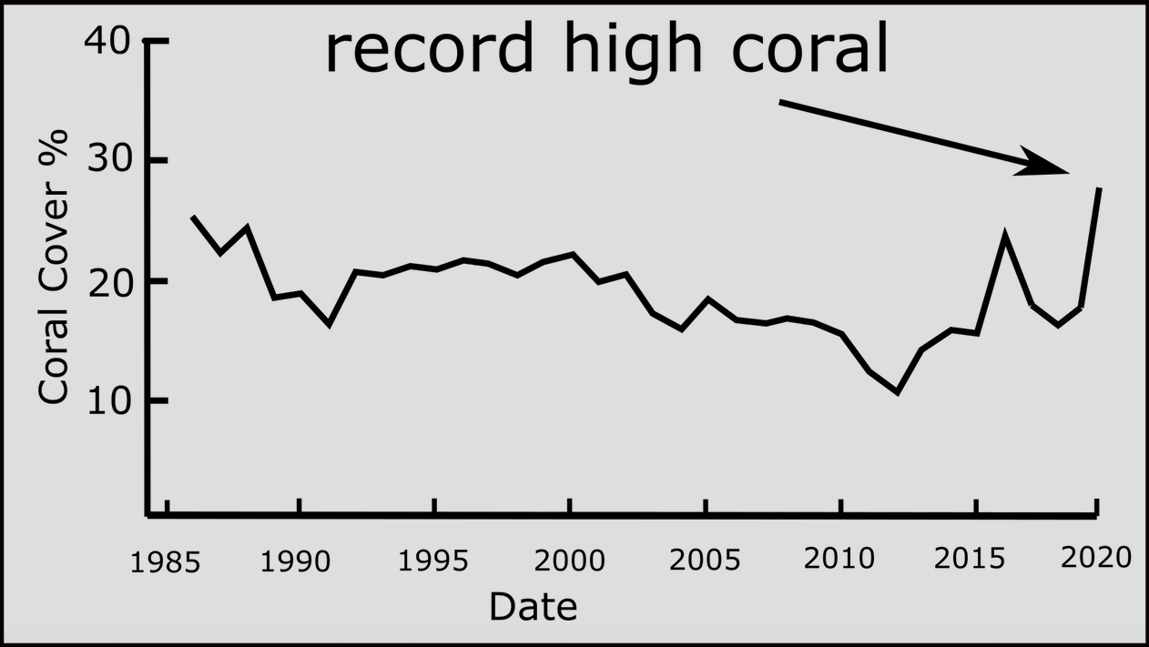 The bad news is that the record high coral cover means it is likely that coral cover will decline in the next few years.