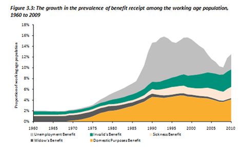 The recession of the late 1980s wrought havoc and receipt blew out in the 1990s to eye-watering levels. While academic lefties will tell you that the welfare state was dismantled under Roger Douglas and Ruth Richardson that’s rubbish. Yes, some cuts to rates were made (but eventually effectively restored via other new forms of second and third-tier assistance). The Family Benefit was abolished but half of the savings were redistributed to needier families (a little known fact). While numbers relying on an unemployment benefit gradually fell uptake of the other three – Sickness, Invalid’s and Domestic purposes continued to climb.