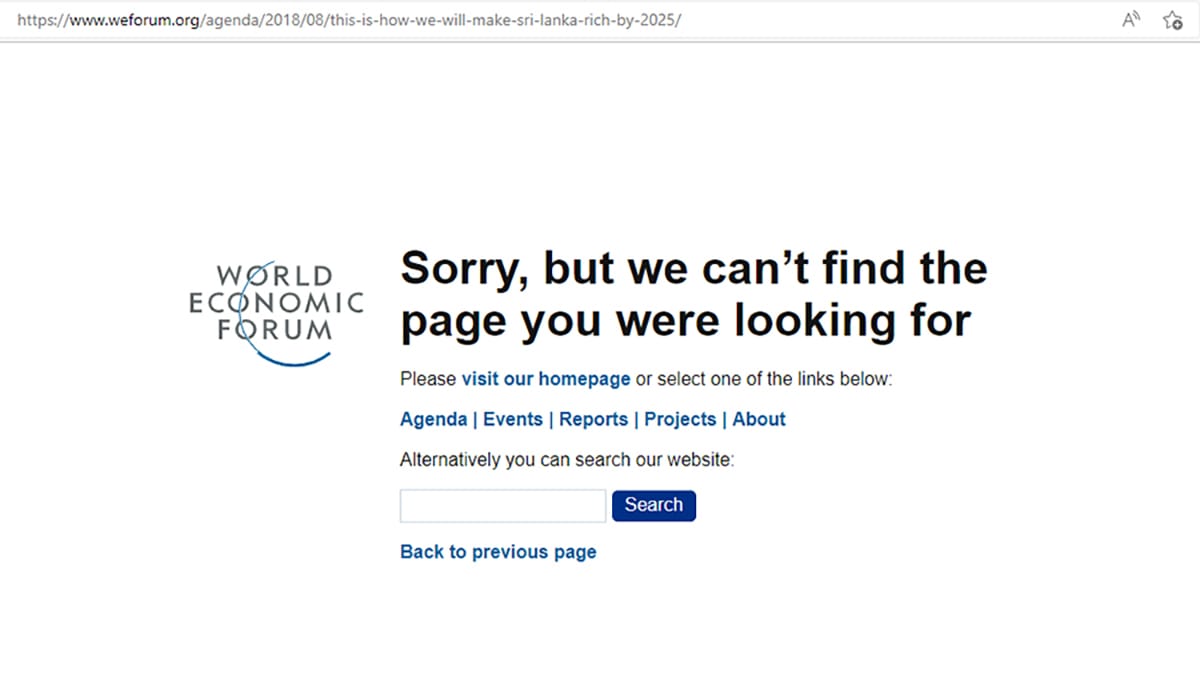 Also purely coincidentally, I’m just as sure, the WEF has suddenly deleted its past bragging about how its graduate was going to make Sri Lanka “rich by 2025”.