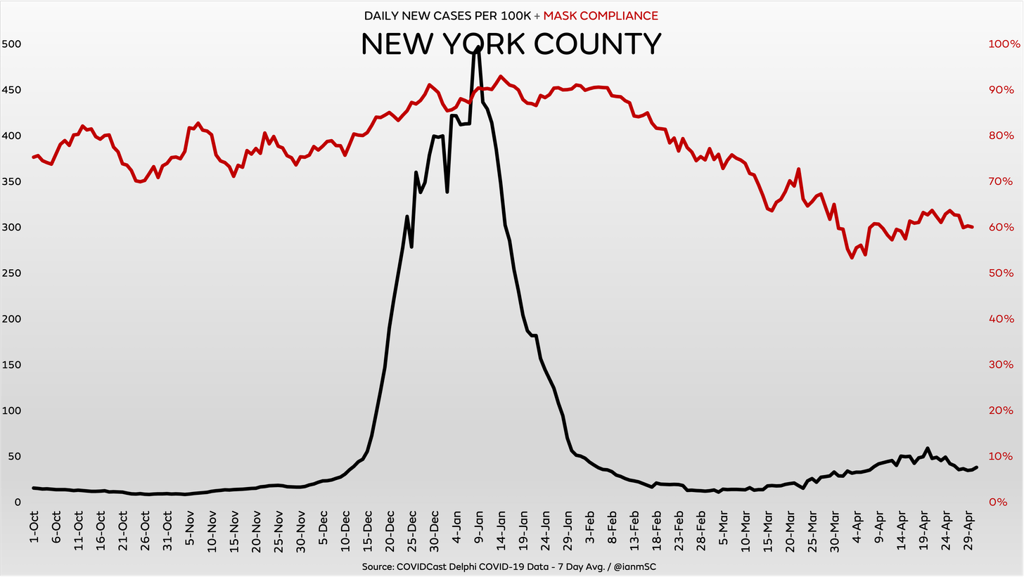 New York County is averaging around 50 cases per 100k with mask compliance above 60%, while the US average is 16.2 cases per 100k with mask compliance of around 30%.