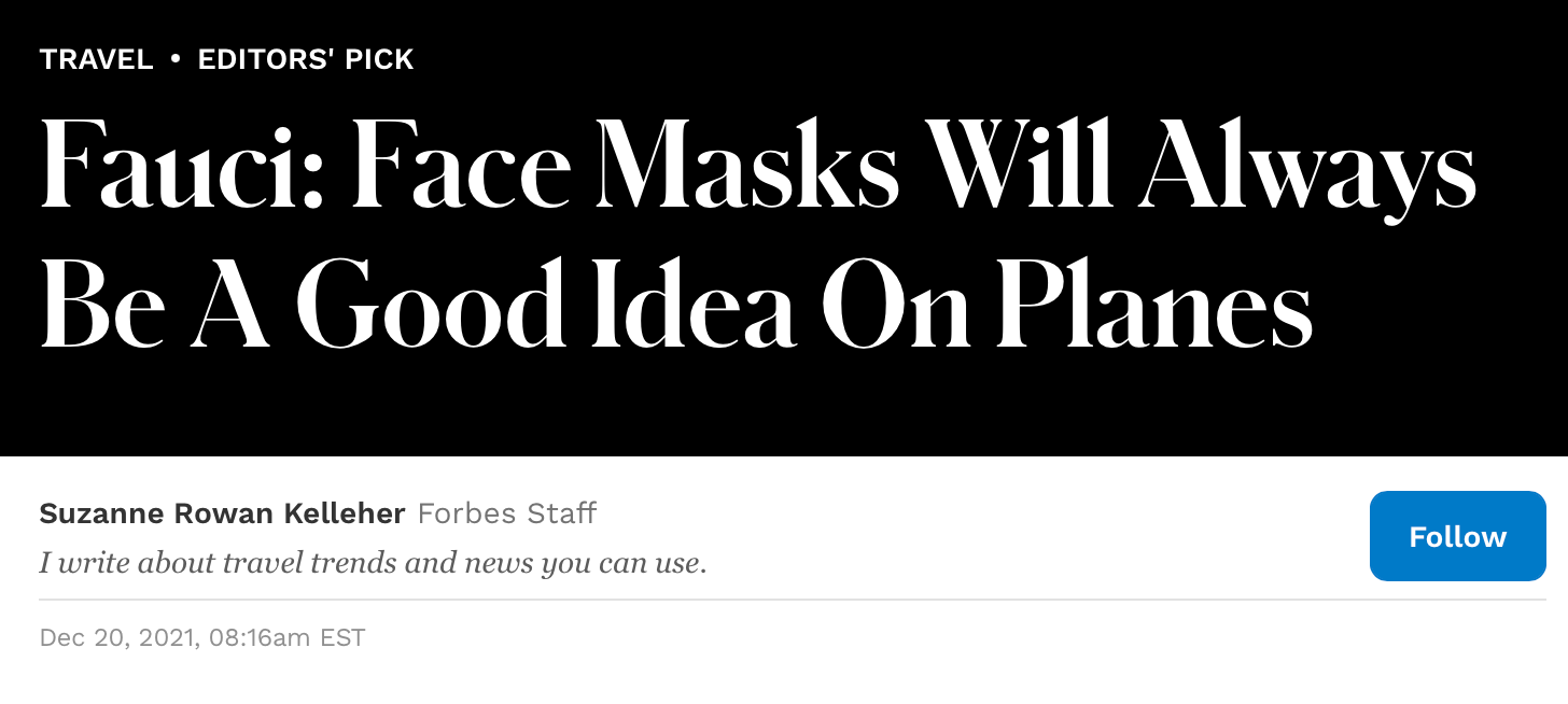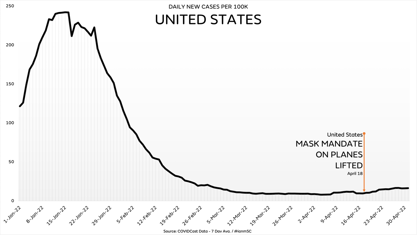 Ending the mask mandate on planes, with no permission from the delusional zealots like Fauci, Jonathan Reiner and Jeremy Faust, did not lead to a dramatic surge of crew related infections, because masks do not work. They never have, and they never will.
