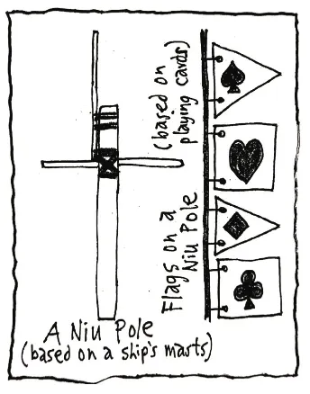 The Hauhau’s religious symbol is the “Niu Pole”, a tall pole with two cross arms at the top representing the calling of the warriors from the four points of the compass to join the fight against the white turnips. Flags are also flown on these poles with symbols on them taken from playing cards (clubs, diamonds).