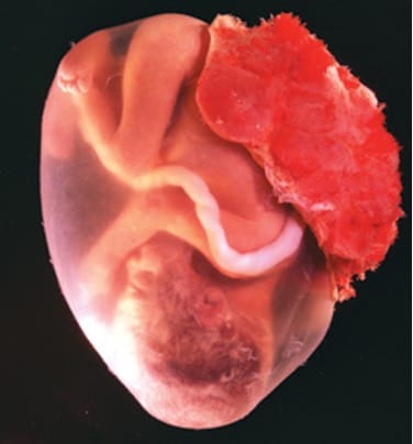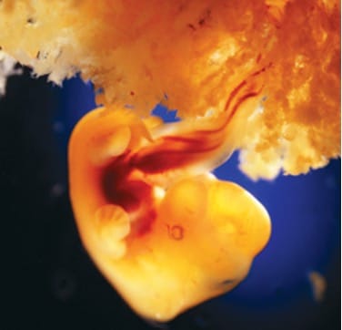 At five weeks, the embryo’s heart begins to beat, although it cannot yet be heard during a medical exam.