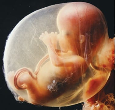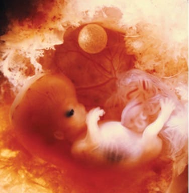 At seven weeks, the embryo’s head is much bigger than the rest of its body. Its arms begin to form as the elbows and hands appear. The fingers are still fused together. The eyes are now quite visible.