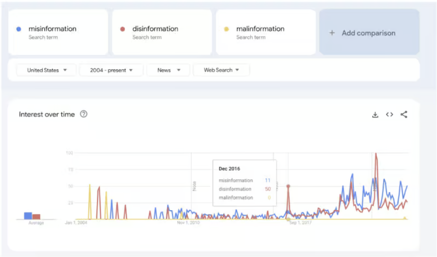 The history of “misinformation,” “disinformation,” and “malinformation” is interesting. This time line from Google trends graphically documents the genesis the spikes in the use of these terms: