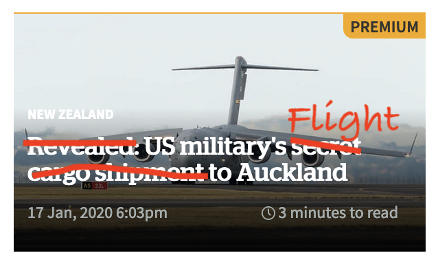 David Fisher wrote 650 words when he could have written: “A big American army plane carrying something landed at Auckland airport, then flew away again after 24 hours, and we know nothing else about it”. That is the basics of the story.