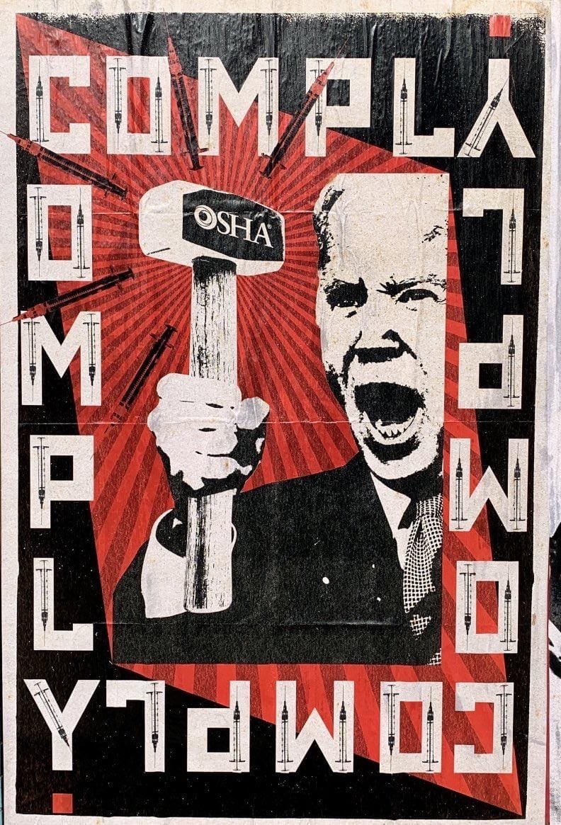 “Comply” is what Biden might look like if he stumbled out from one of his multi-million-dollar homes at 2 o’clock in the morning because you stole all his garden gnomes. The logo-accurate Osha mallet is a menacing bit of seriousness because mandates are a live and consequential political issue, but his face and the Cyrillic-styled “Comply” loaded with vaccines keeps anyone from taking this seriously.