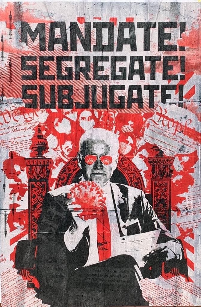 The third poster takes a more sinister turn, “Mandate! Segregate! Subjugate!” This is closest in style to a malevolent and chaotic comic book villain—something out of Morrison’s “Outer Church,” or maybe Lucifer from DC Comics. This poster screams conspiracy. The tattered constitution, the masked hoards, the ghostly reproduction of Fauci in the shadows, is all standard fare.