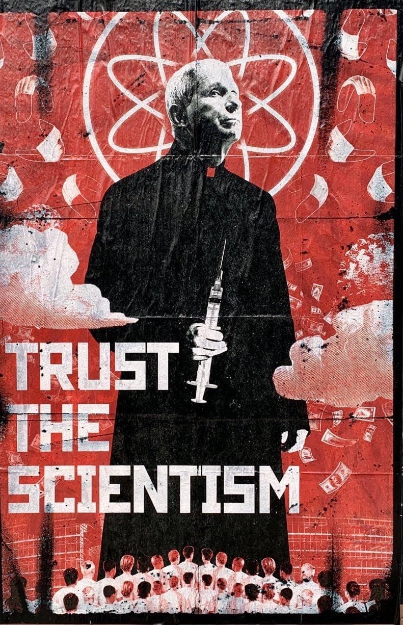 This is most commonly, and gratingly, exemplified by the phrase “follow the science,” which this poster parodies. Here we have Fauci dressed like a priest, or maybe Neo from the Matrix. Either way, his giant syringe looks like a Sesame Street prop, and the atomic energy symbol looks more like something from Pinky and the Brain than a nuclear test site.