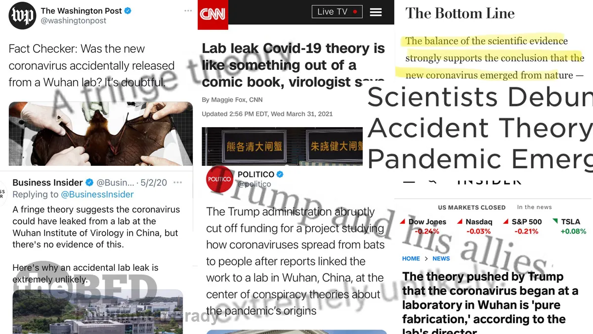 When the lab-leak theory first emerged, Trump naturally addressed it as a possibility. Cue deafening screams of “Orange Man Bad!”