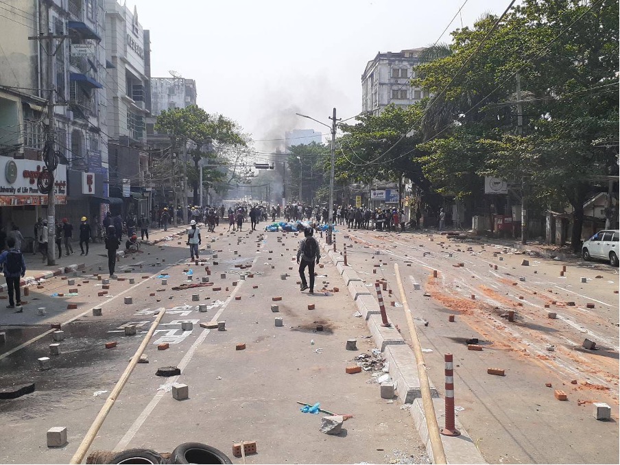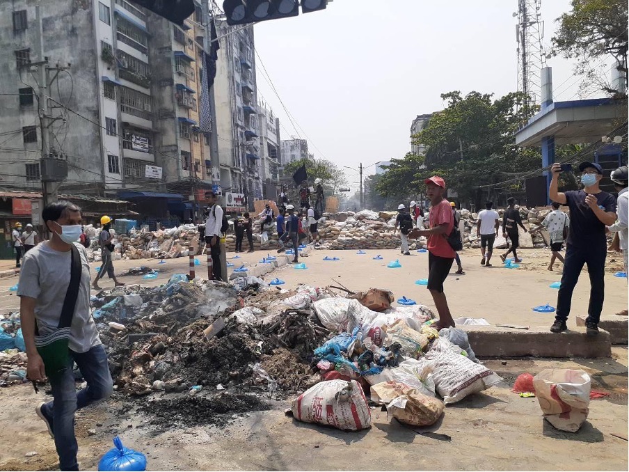 In some areas the protests have taken on a dramatically different atmosphere from the days following the coup. Downtown Yangon, once filled with peaceful demonstrators displaying all manner of creative opposition to the coup in a carnival-like atmosphere, is now all but deserted. The air is thick with ire, fear and desperation when protesters still took to the streets in some areas while some roads in the city belong to trucks transporting soldiers and police.