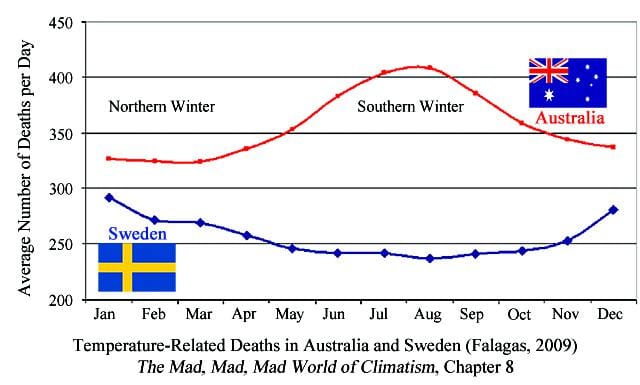 The late Dr. William Keating studied temperature-related deaths in six European countries for people aged 65 to 74. He concluded that deaths related to cold temperatures were nine times greater than those related to hot temperatures. Dr. Bjorn Lomborg, president of the Copenhagen Consensus Center, has pointed out that moderate global warming will likely reduce human mortality.