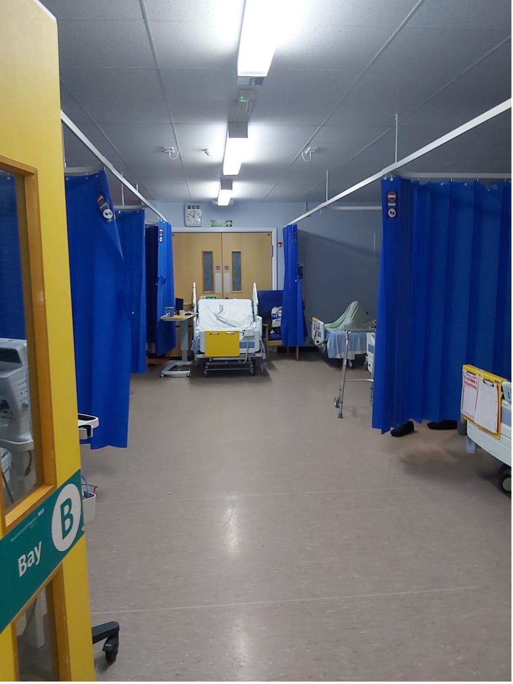 In a 6-bed side ward, pressure on beds is so intense they have to squeeze an extra one in. It has no privacy, no screens, limited space for personal items and difficult access for support equipment. Most important of all, it is blocking access to the fire exit! They have obviously learnt from hot bedding as practised in the navy as discharge involves being told that the bed is needed, go to the day room and we will prepare the discharge notes.