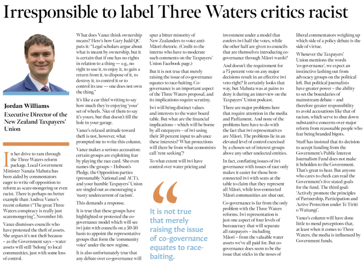 Whenever the Taxpayers’ Union mentions the words ‘co-governance’, we expect an instinctive lashing out from advocacy groups on the political left. But political journalists have greater power – the ability to set the boundaries of mainstream debate – and therefore greater responsibility to avoid accusations like that of racism, which serve to shut down substantive concerns over major reform from reasonable people who fear being branded bigots.