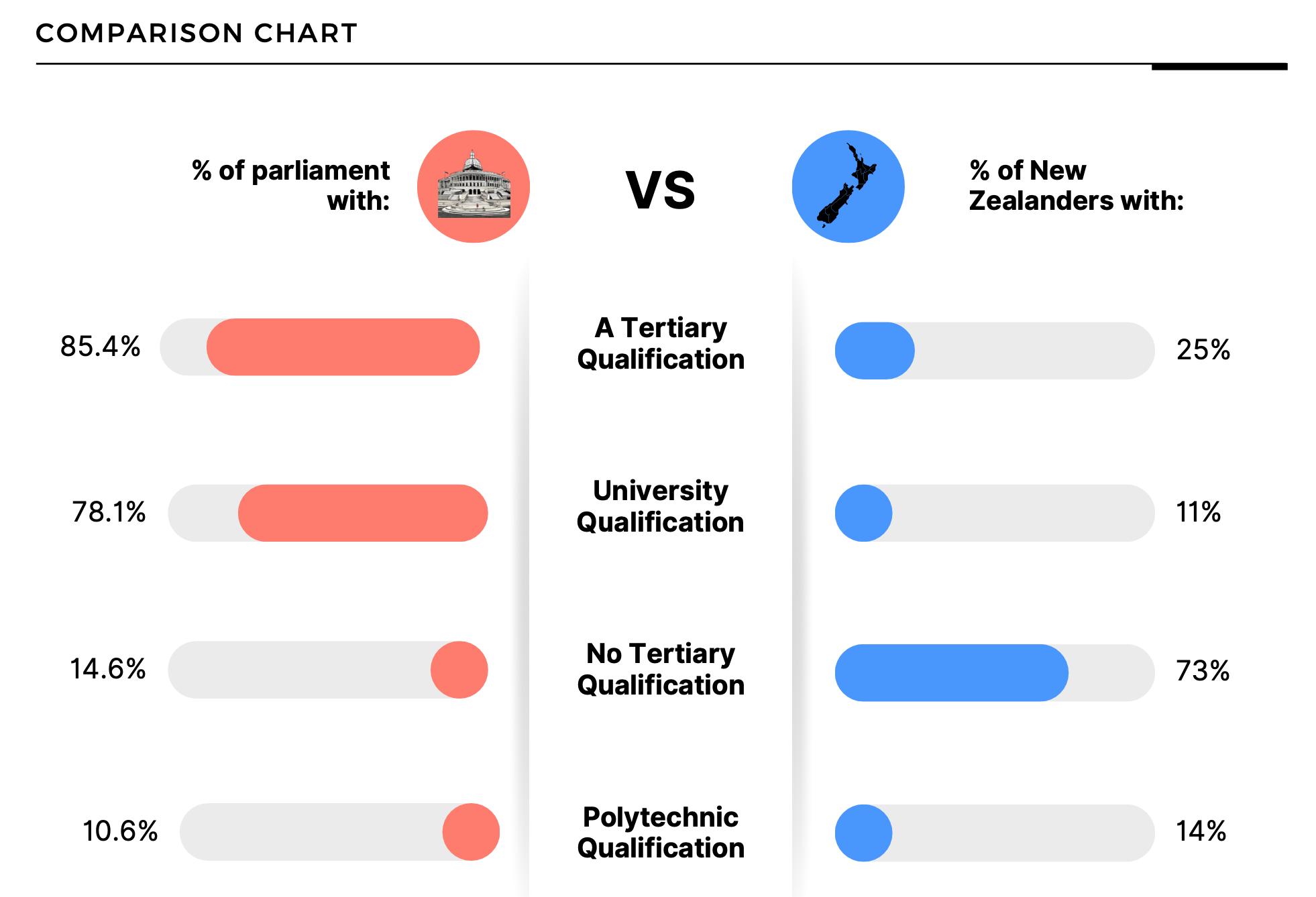 The chart below illustrates some of the education differences between the New Zealand Parliament and the wider society.