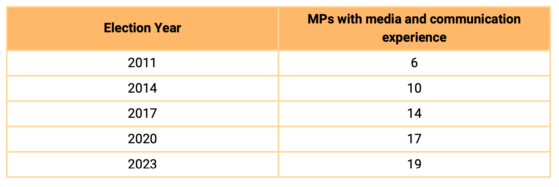 There is also a fast-increasing number of MPs with backgrounds in media and communications. As seen in the table below, since 2011 the number of politicians with backgrounds in media and PR has tripled.