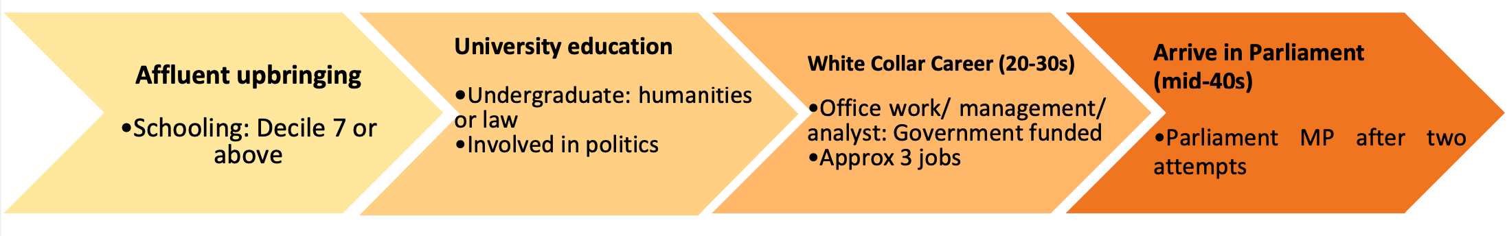 It’s at university that MPs generally become “politicised” say the researchers, who studied their biographies. They generally study in the humanities, arts and law – the research found that 48% have degrees in those areas. They then generally become active in a political party, work in about three office jobs, and then in their early to mid-40s get into Parliament, normally after 2-3 attempts.