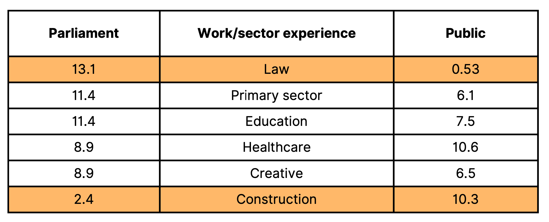 All these professions are now over-represented in Parliament, compared to wider New Zealand population. The chart below shows the over- and under-representation of professions in Parliament. For example, although about 0.5% of the public have legal work experience, about 13% of MPs do.